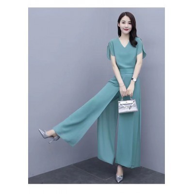 2022 New summer solid color chiffon wide leg pants set solid color short sleeve skirt set pants two