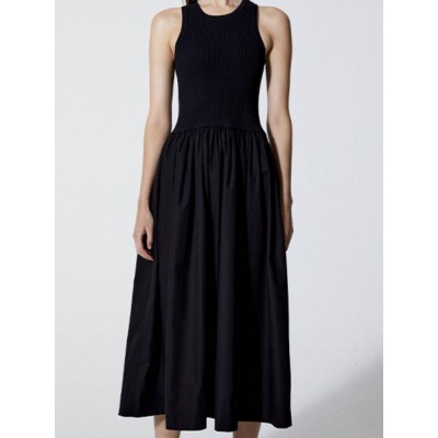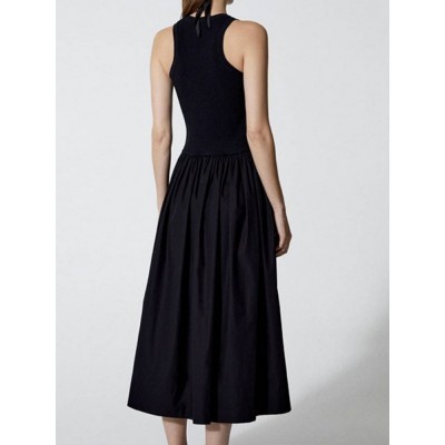 2022 Spring Summer New Round Neck Solid Color Sleeveless Stitching Pleated Women A-line Vest Midi Dr